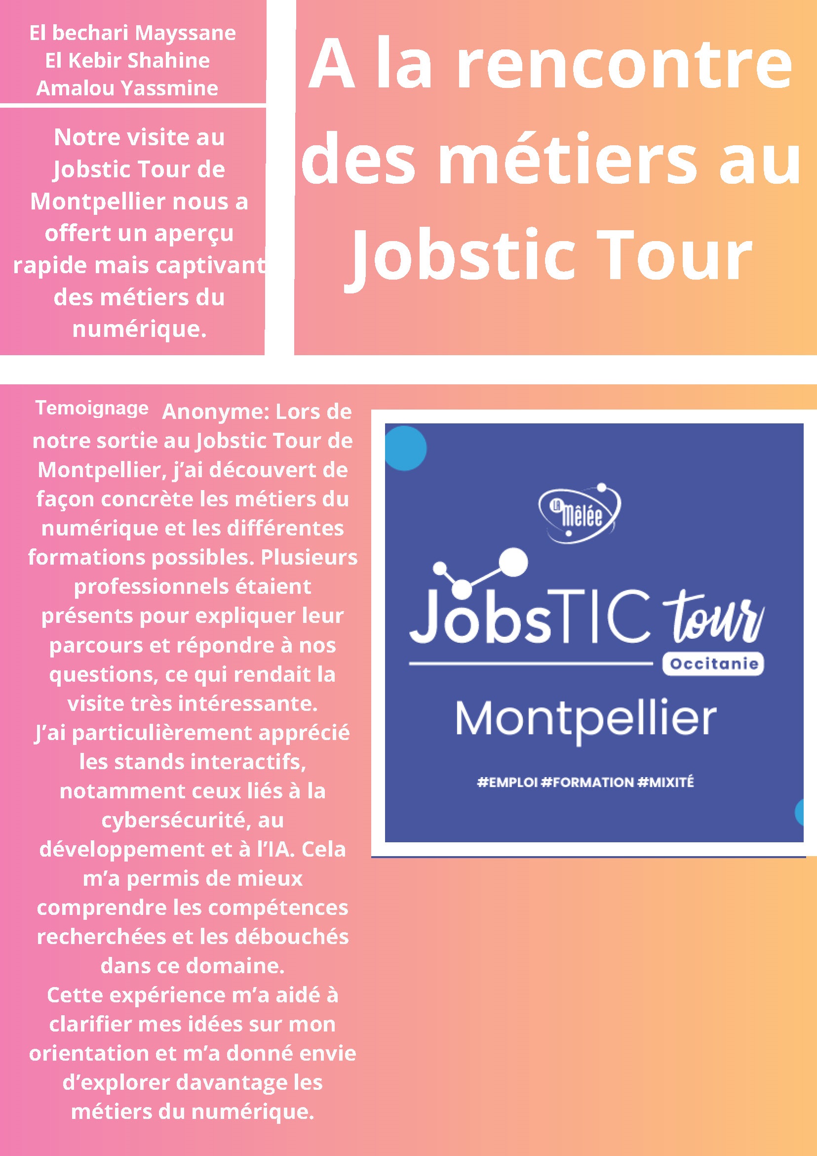Le Jobstic Tour Occitanie est un événement itinérant conçu pour aux jeunes. À Montpellier, il s’est déroulé dans les locaux de la , un espace dédié à l’innovation et à l’orientation professionnelle. L’objectif principal était de , de montrer leur diversité (développement, cybersécurité, intelligence artificielle, 3D, marketing digital, etc.) et de mettre en contact les élèves avec des professionnels du secteur.